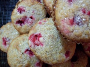 Have you ever opened the mailbox to find a packet of unsolicited recipe cards peeking out?  Usually they’re a teaser, trying to convince you to subscribe! now! and you’ll get a packet every month for the rest of forever (for a low, low price, of course).  We tend to get these every few months, and like to poke through the recipes before throwing them out.  Recently, one of the cards promised the ‘Best-Ever’ muffins.   The base recipe looked promising, but not quite what I was looking for.  Not being in a blueberry mood, I decided to make them with cranberries.  Not too shabby!