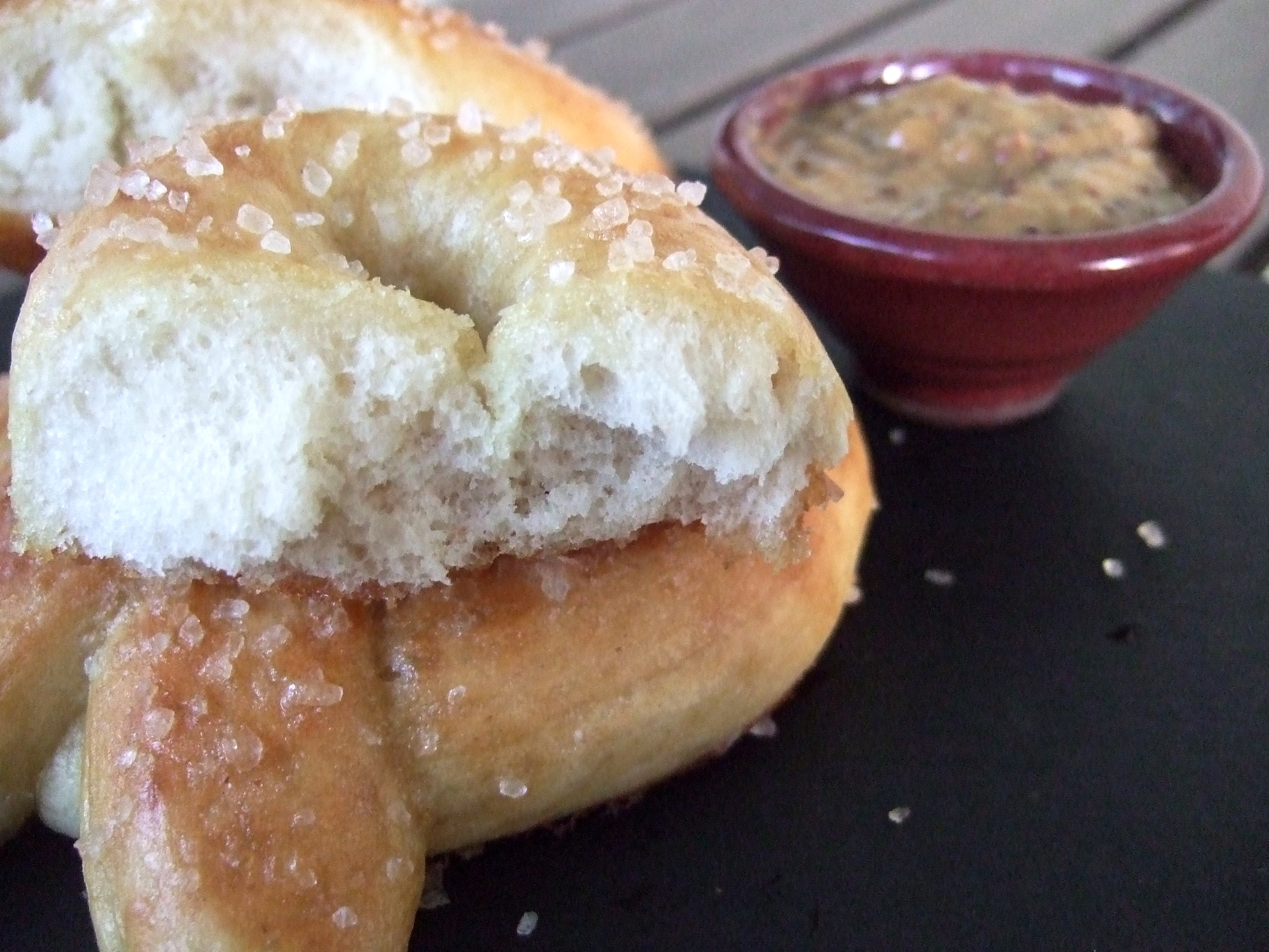 Hot Buttered Pretzels. Yum. Mrslovey’s been after me to try making pretzels for a while. In fact, I think they may have been the ulterior motive behind her suggestion of handheld month, when I wasn’t sure what I wanted to tackle next. So needless to say, she was pleased as punch when I realized I could make them with ingredients on hand, in a relatively short amount of time. I followed the manual/mixer method listed in the recipe, the only thing I did different was to cook one pan at a time, due to having one of my oven racks in permanent use for the most awesome baking stone ever (thank you for sharing that secret with me, K!). Whoops, see? Got distracted again there! Anyway. While none of the steps are overly complicated, there did seem to be a lot going on, so I’d strongly recommend having everything you need laid out and ready to go before you start. If nothing else your hands will be oily and doughy, and you won’t really want to touch too many things with them. The pretzels came out beautifully. The first batch was a little pale and splotchy (see note in recipe about fully dissolving your baking powder, and heed it), but the second batch was, as they say, GBD – golden brown and delicious. As you may be able to tell from the pictures, I got a little excited with the salt, so we ended up brushing a little bit off when we ate them, but over all I’m very pleased with the results. Served warm with a little dish of mustard (maple horseradish in this case), they were a delightful evening treat on a day that had started out poorly.