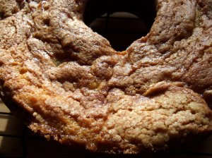 • Bake for about an hour (until tester comes out clean) in a greased and floured tube pan, or two mini loaf pans (reduce baking time).