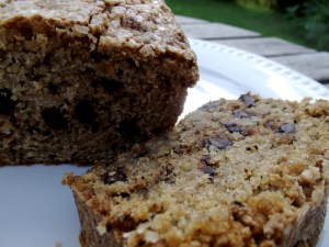 Did I mention that this squash was a little on the large side?  Well it’s a good thing it was so huge, because I completely forgot to add salt to the first batch, and it tasted awful.  Throw-it-in-the-trashcan-awful.  Luckily, I still had more than FIVE FREAKING CUPS of zucchini left (I’m telling you, it was enormous!), so I decided to use the rest to make a double-batch*.  Waste not, want not, right?  I also decided to add some dark chocolate chips, as an homage to the chocolate zucchini cake that my mom makes, which is the only other way that I’d eat zucchini prior to this.